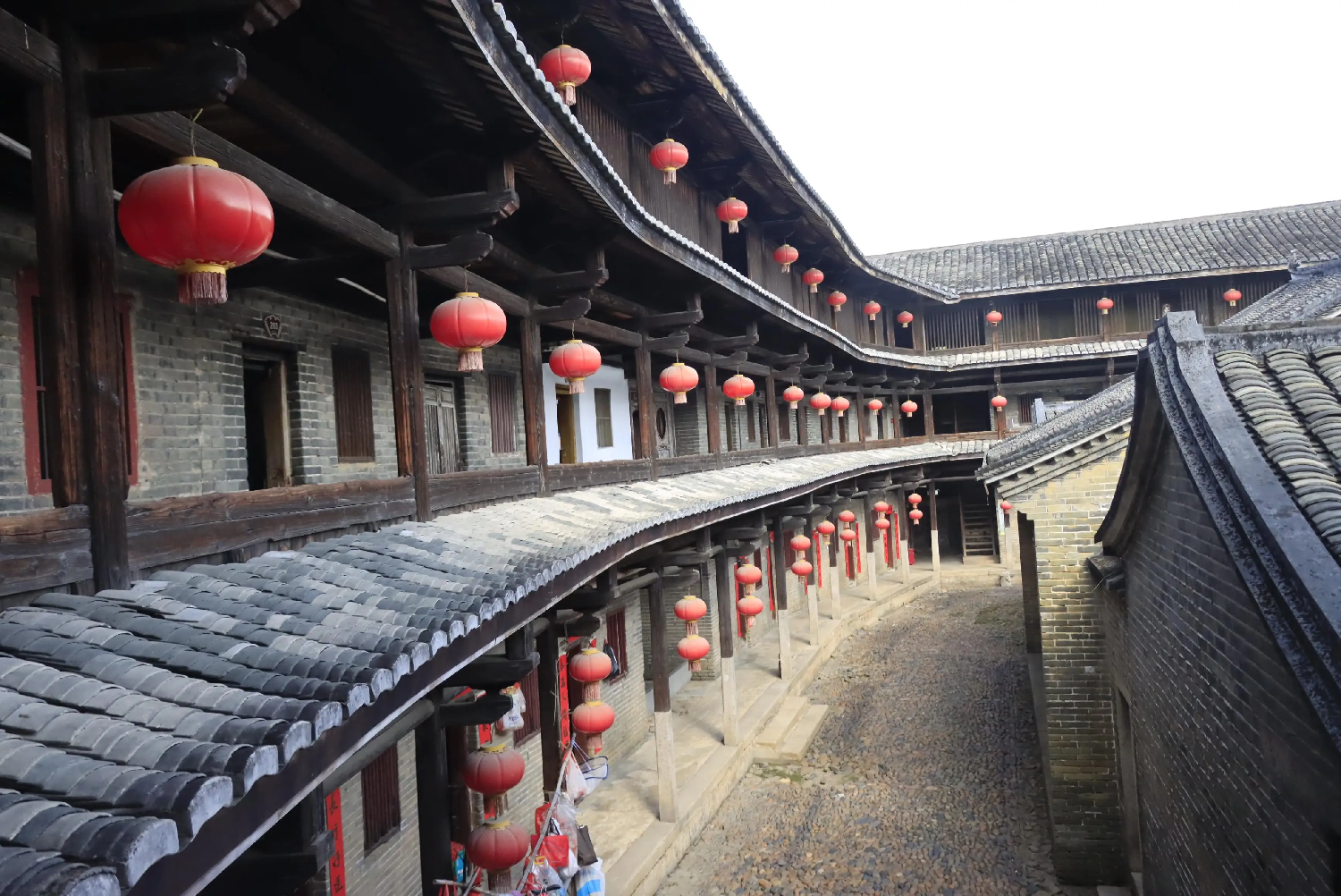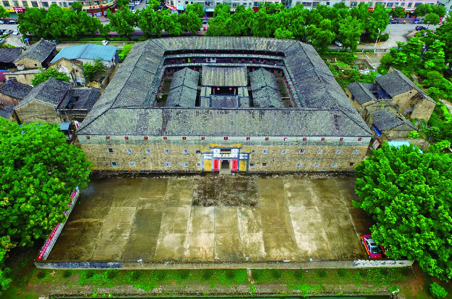 国家历史文化名城梅州,作为历史上客家民系的最终形成地和聚居地之一,坐拥 2万多座客家民居,土围楼、圆寨、走马楼、四角楼……仅一个大埔县就拥有 23个中国传统村落,超 3千座传统民居建筑。位于大埔县湖寮镇龙岗村的泰安楼,是广东最大的方形石楼之一。远远看去,泰安楼外立面近似四方形,三层方形楼房环抱主体平房,形成“楼中有屋、屋外有楼”的格局,风格独特。