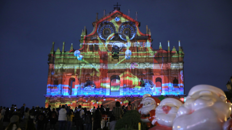 2019年底,民众在澳门大三巴牌坊欣赏澳门光影节的光雕表演。(图片来源:中新社)