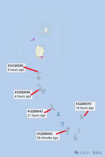 Marine Traffic自动识别系统(AIS)警报的船只位置在弗洛雷斯岛东南海岸,距离Lajes das Flores港口约20海里和30海里。这些位置记录的时间间隔超过20个小时,表明约有20多艘船只发出了信号,时间间隔为数小时。除了短暂的信号外,可以看到许多船达到30节甚至40节的航速,这与渔船(悬挂中国国旗)的类型和行动不符。