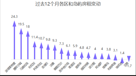 值得强调的是,在租房最贵的地区排名中,里斯本(19.9欧元/平方米)居首,其次是波尔图(15.5欧元/平方米)、马德拉岛(15.1欧元/平方米)、法鲁(14.3欧元/平方米)、塞图巴尔(13.4欧元/平方米)、科英布拉(10.4欧元/平方米)、埃武拉(10.4欧元/平方米)、圣米格尔岛(10.1欧元/平方米)、阿威罗(9.6欧元/平方米)、布拉加(9.6欧元/平方米)、莱里亚(9.4欧元/平方米)、贝哈(8.8欧元/平方米)、维亚纳堡(8.5欧元/平方米)和圣塔伦(8.2欧元/平方米)。出租房屋价格最经济的地区是波塔莱格雷(6.9欧元/平方米)、布朗库堡(7.1欧元/平方米)、维塞乌(7.2欧元/平方米)和雷阿尔城(7.4欧元/平方米)。