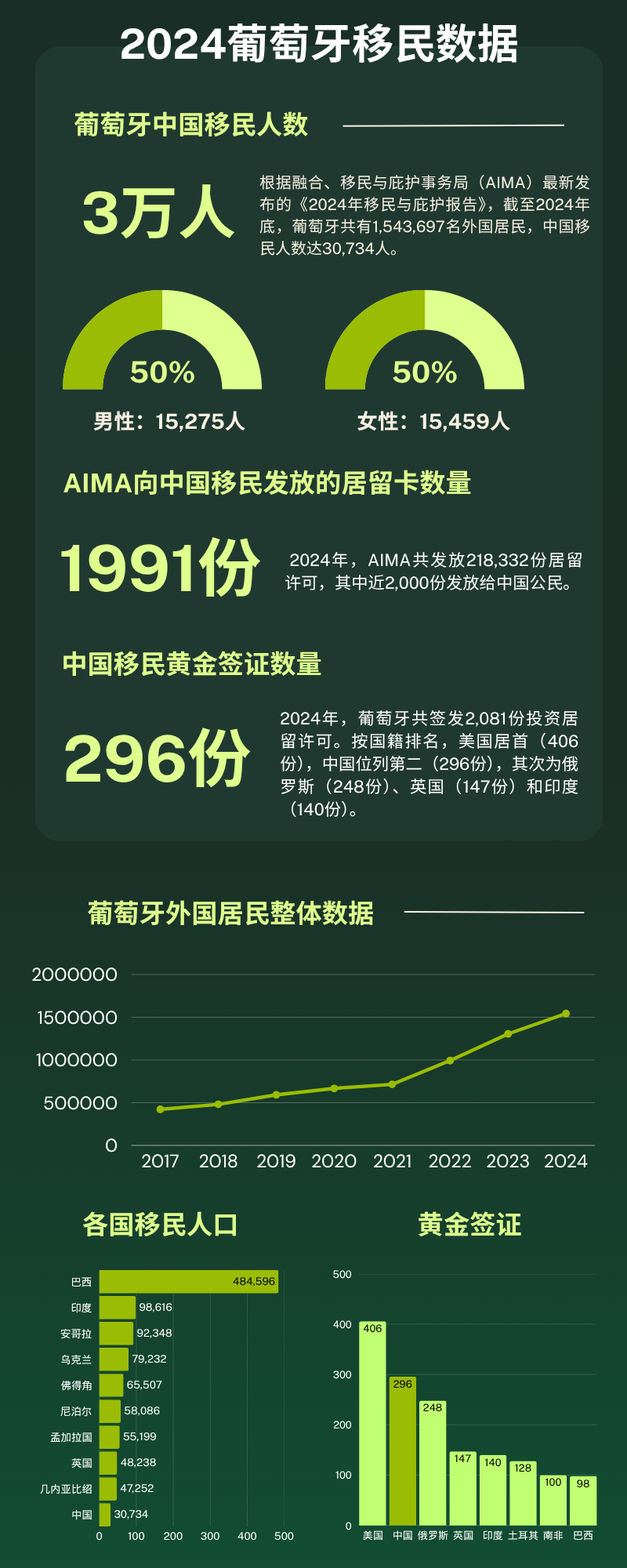 根据融合、移民与庇护事务局(AIMA)最新发布的《2024年移民与庇护报告》,截至2024年底,葡萄牙共有1,543,697名外国居民,较2017年的42万大幅增长近四倍。