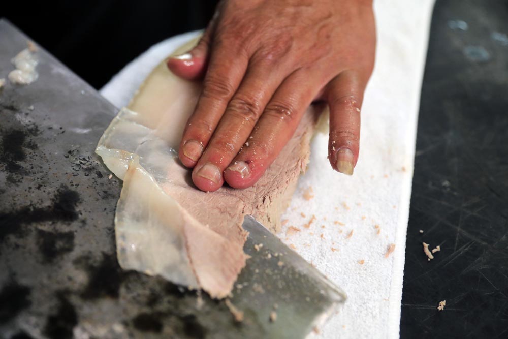 选料要“精”,猪肉需出自体重280斤以上、饲养逾8个月的粮食猪,且只有二刀肉才有细嫩化渣的口感。火候要“准”,开水下锅后,根据猪肉大小适时调整火候,这样的肉才能片出晶莹剔透、色泽如玉的既视感。“利”和“绝”更多是刀上功夫,片出极致的薄,不仅要一柄利刃,还要奇绝的刀法,更是一个磨炼耐心、提高心性的过程。