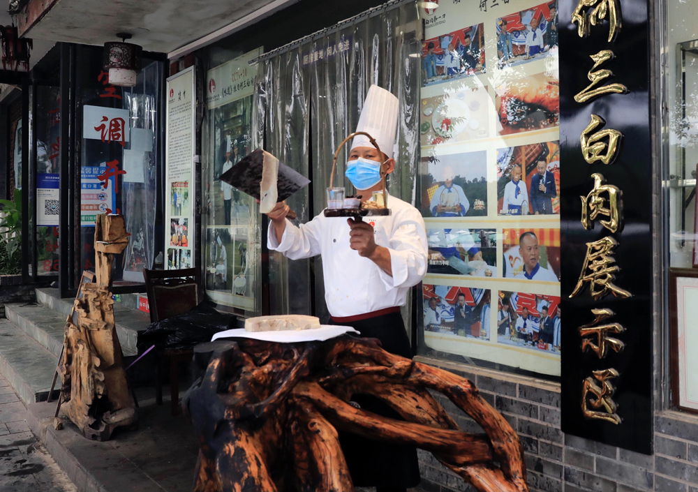 如今的李庄,以白肉为招牌的饭店不下十家。临近中午,各家白肉师傅偏爱沿街摆开阵仗,表演大刀片肉的绝活,一刀、一案、一块白肉,成当地一景。