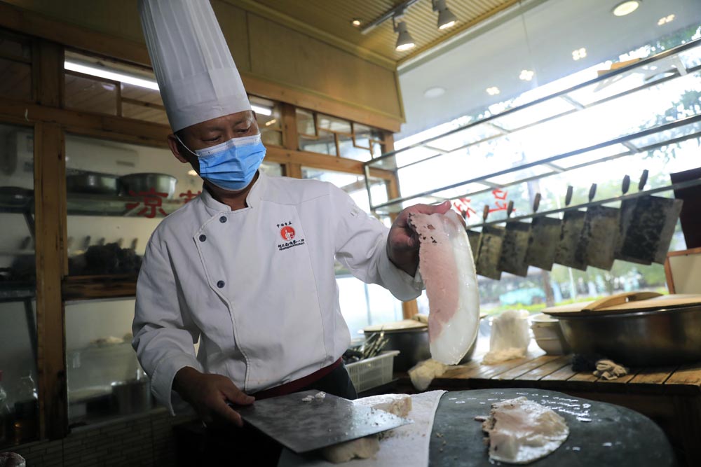 白肉师傅何卫东正在切肉片。(图片来源:中新社)