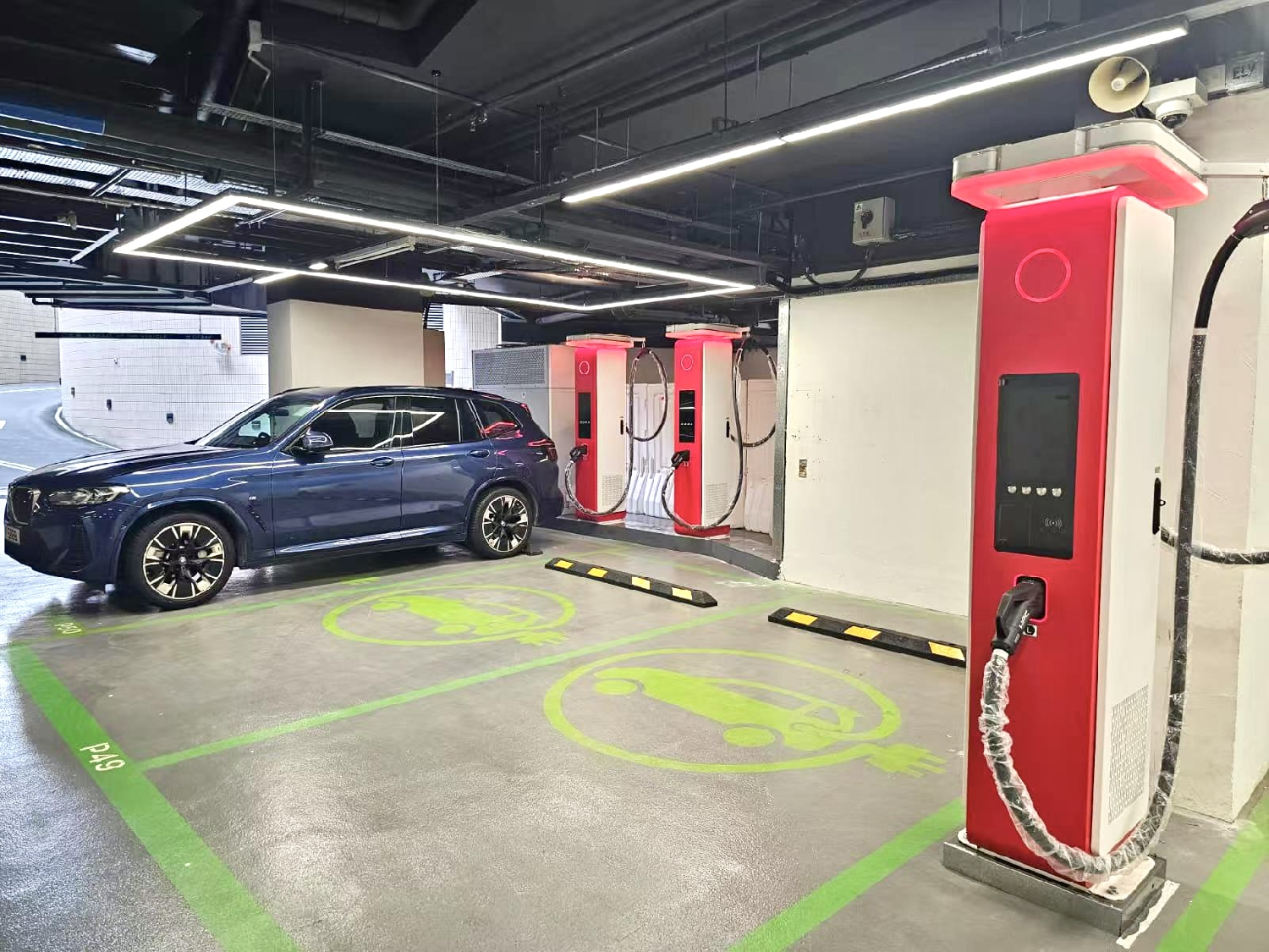 图为华为在香港将军澳蓝塘汇商场停车场内设置的充电站。(图片来源:中新社)