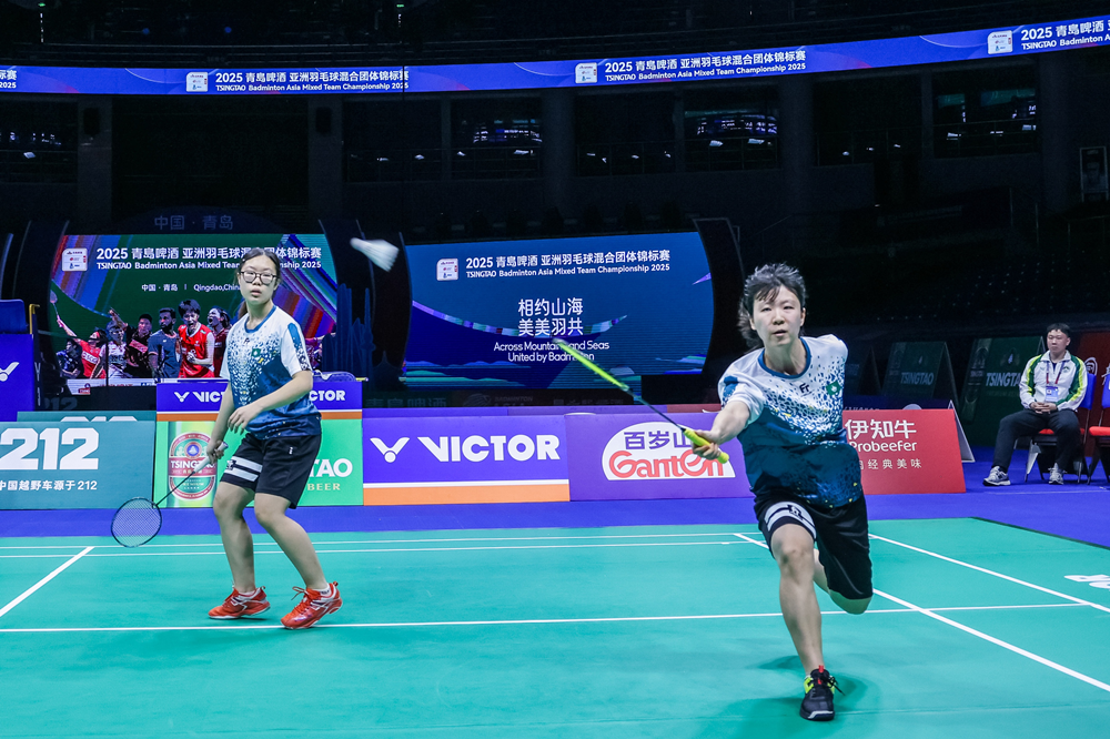 2月12日,中国澳门队选手裴梓桦(右)与队友出战2025亚洲羽毛球混合团体锦标赛女双项目。(图片来源:亚团赛组委会供图)
