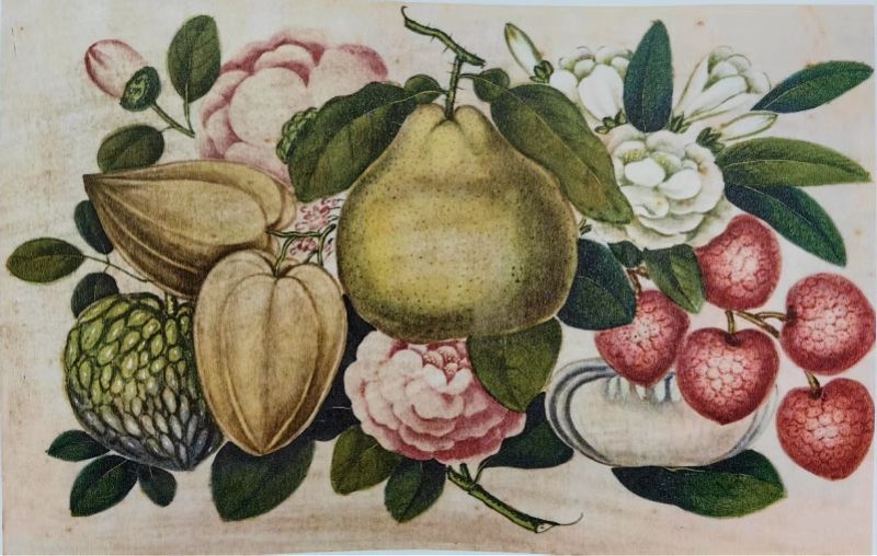 这则文字是当时广州外销画行业繁盛的见证。十八、十九世纪,在广州一口通商的年代,大量描绘中国风土人情的外销画,包括纸本水彩画、壁纸画、玻璃画、通草画等,漂洋过海销往欧美。其中,荔枝既是岭南风物的代表,又成为中国文化的重要符号,以绘画为媒介,流传至西方社会。现藏于荷兰、英国、美国等地博物馆的相关画作显示,荔枝作为植物、装饰品和生活场景,扮演跨文化交流的重要角色。