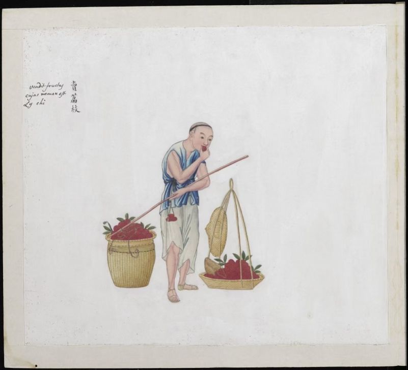 荷兰莱顿民族学博物馆藏有多幅表现街头小贩给荔枝称重、售卖荔枝的中国外销画。其中一幅卖荔枝的画作上,分别有中英文标题,卖荔枝的男子似乎没有为商品销路担忧,反而自个儿品尝起来,满足口腹之欲。