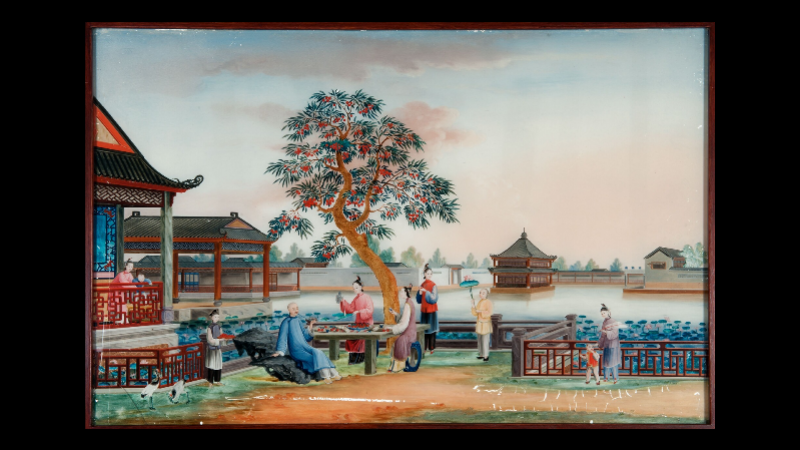 学者江滢河著文称,十八世纪中叶,英国社会对中国外销玻璃画需求达到顶峰,一些玻璃画还被当作镜子镶嵌在家具上,成为英国上流社会家居生活的重要陈设。