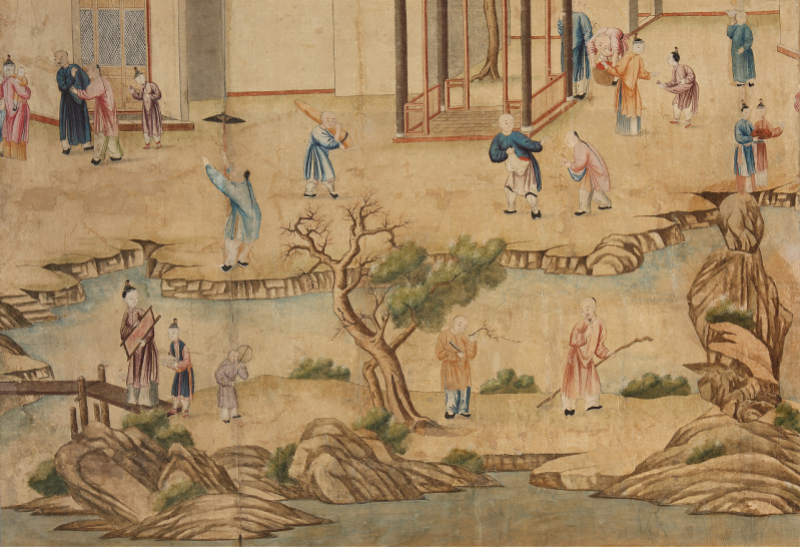 这组十八世纪的手绘中国出口壁纸,最早由英国的拉斯切利斯家族购买,用来装饰他的夏活庄园里的中国房间。根据记载,亨利·拉斯切利斯是东印度公司商船“约克号”的船长,1741年至1748年三次到访广州,这套壁纸就是亨利到访广州时的订购之物。200多年后,其中12幅经广东省博物馆购藏,重回故乡广州。