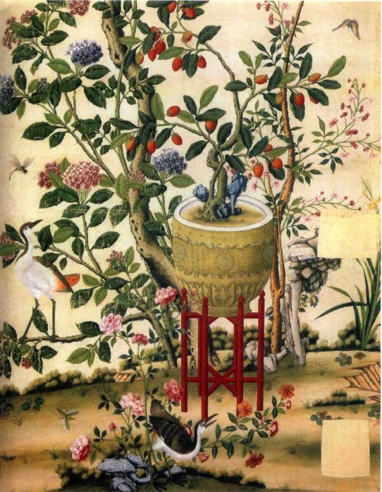 英国维多利亚与艾尔伯特博物馆收藏一幅十八世纪末十九世纪初的中国壁纸画《花果盘景图》,尺寸为243.9厘米×122厘米,体现具有强烈东方色彩的园林风光。画面中,一株荔枝树种在海青大瓮内,旁有太湖石陪衬,红荔成串、绿叶遮掩,甚是夺目。盘景外还有绣球花、海棠花、牡丹等,绣球花枝干、牡丹枝旁各有一只丹顶鹤。