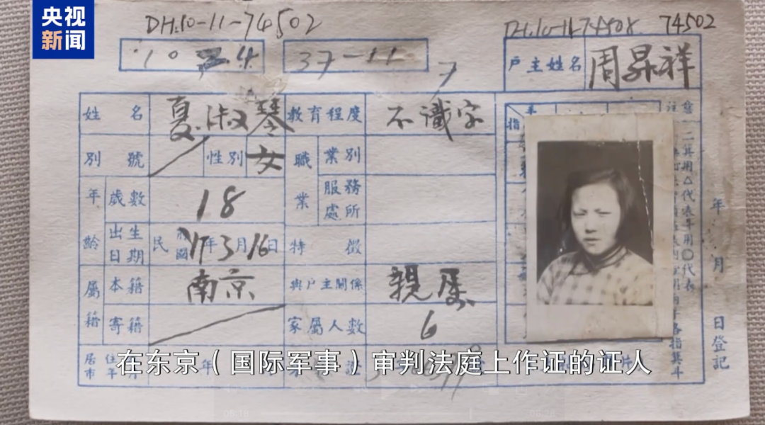 南京市档案馆宣传教育处工作人员讲述,档案馆展柜里展出南京大屠杀幸存者户籍卡,其中有一张是夏淑琴老人的。今年已经96岁的她是东京国际军事审判法庭上的证人,证明了她当年生活在南京,而且是南京大屠杀的见证人,这是很重要的历史证据。