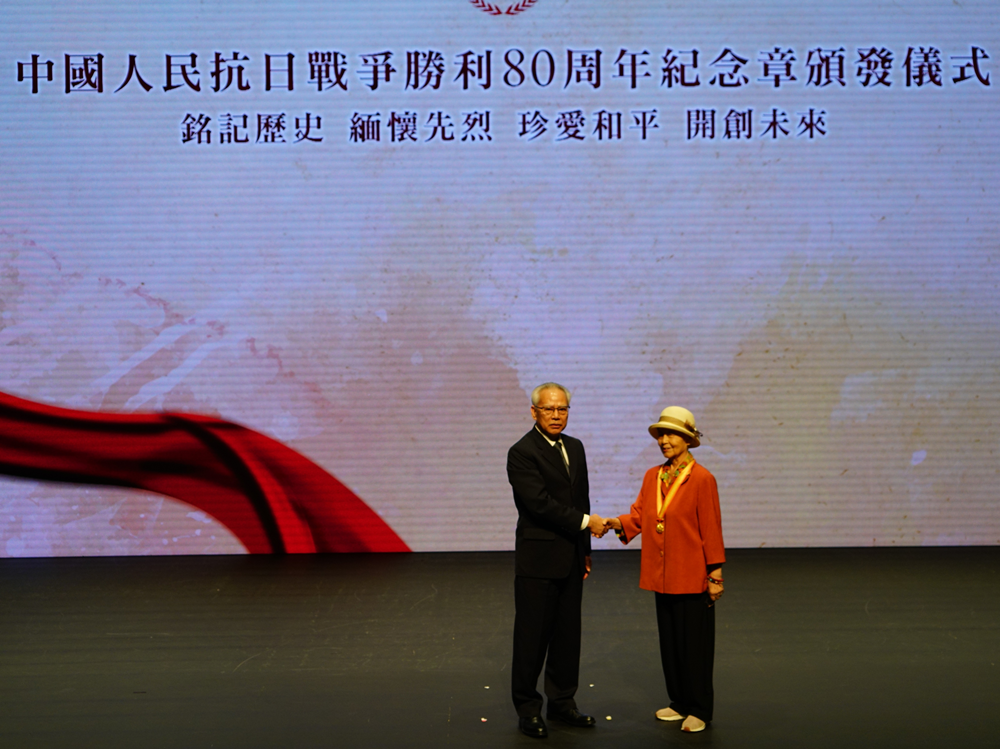 8月25日,澳门特区政府在澳门文化中心举行“中国人民抗日战争胜利80周年”纪念章颁发仪式。图为澳门特区行政长官岑浩辉(左)向抗战烈士家属梁凤文女士(右)颁发纪念章。(图片来源:中新社)