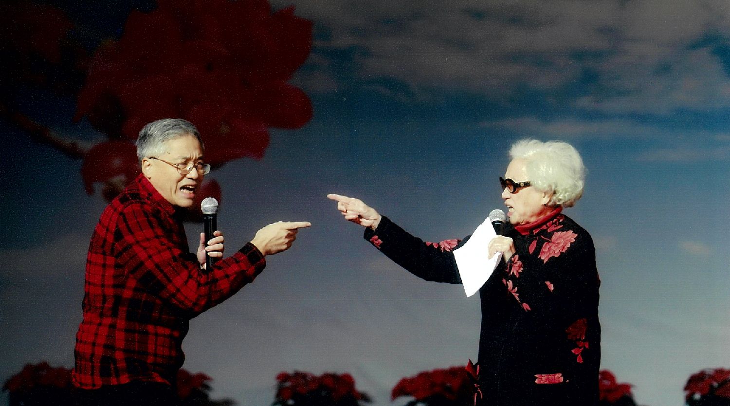 2012年,马鼎盛在母亲红线女生日聚会上,与她同台表演父亲马师曾的名剧《苦凤莺怜》。(图片来源:受访者供中新社图)