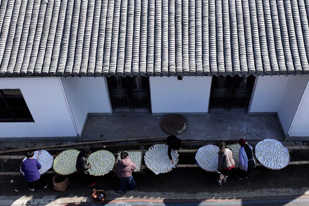 1月8日,在蔡家桥镇朱旺村,村民晾晒加工好的年糕。(无人机照片)(图片来源:中新社)