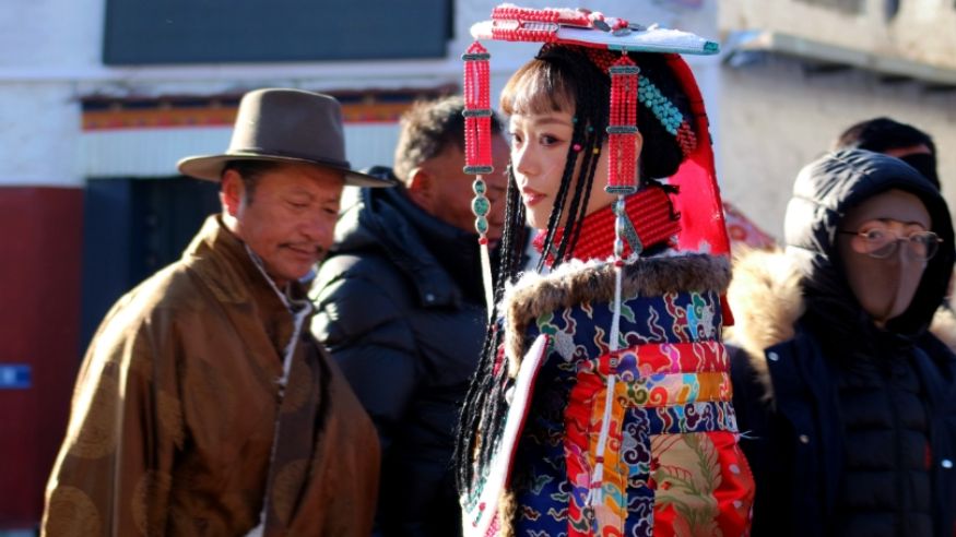 1月15日,游客在拉萨市八廓街拍摄藏服写真。(图片来源:中新社)