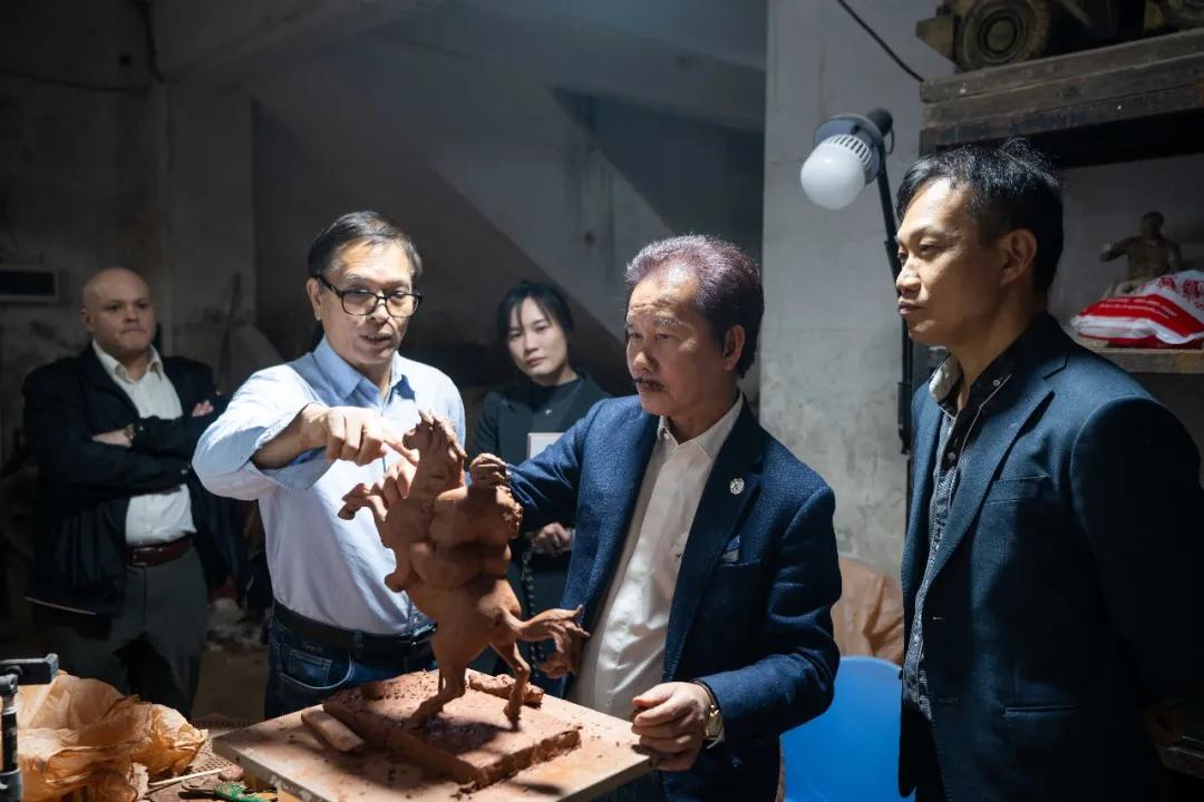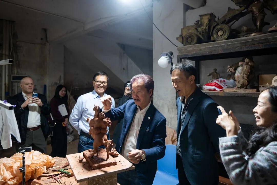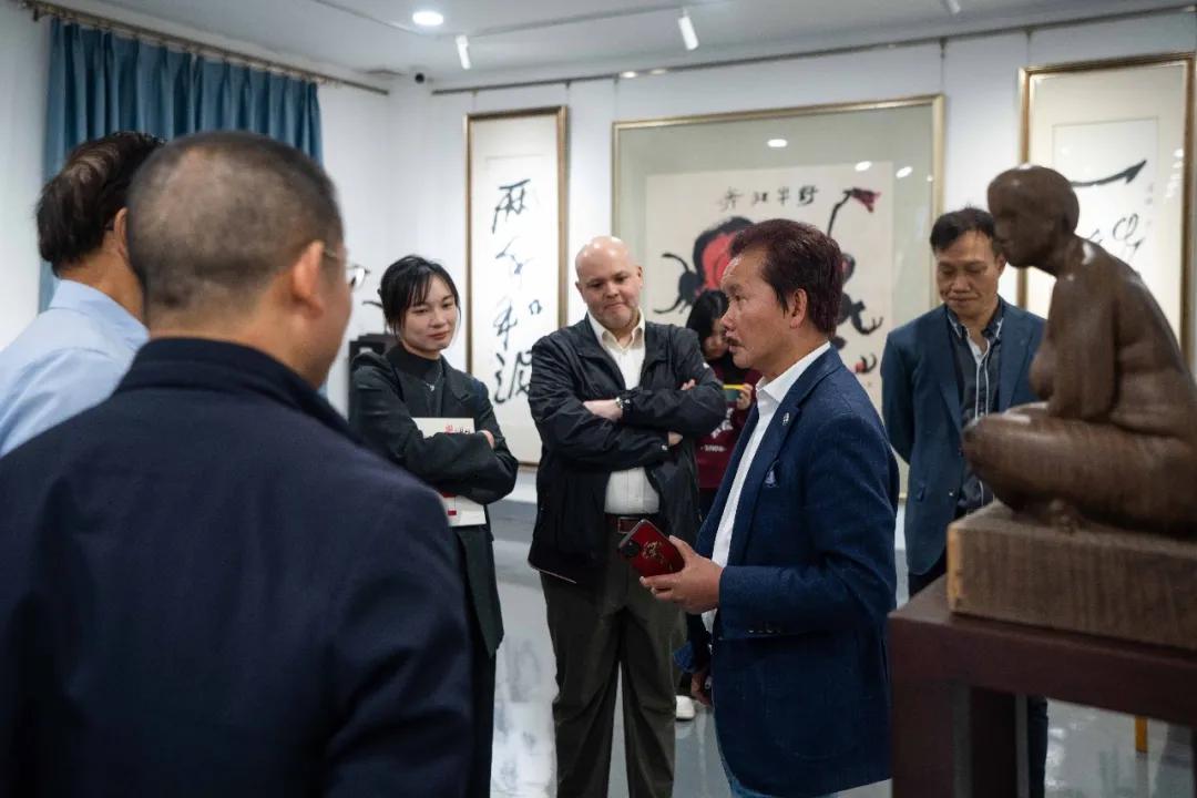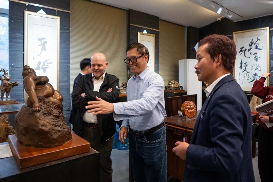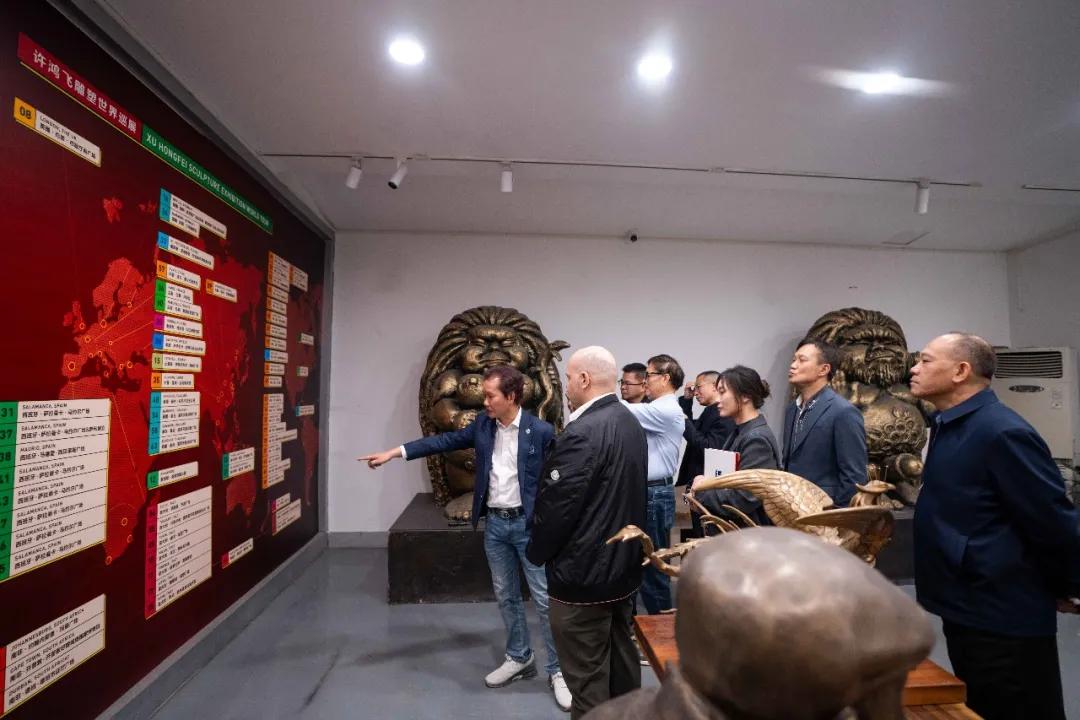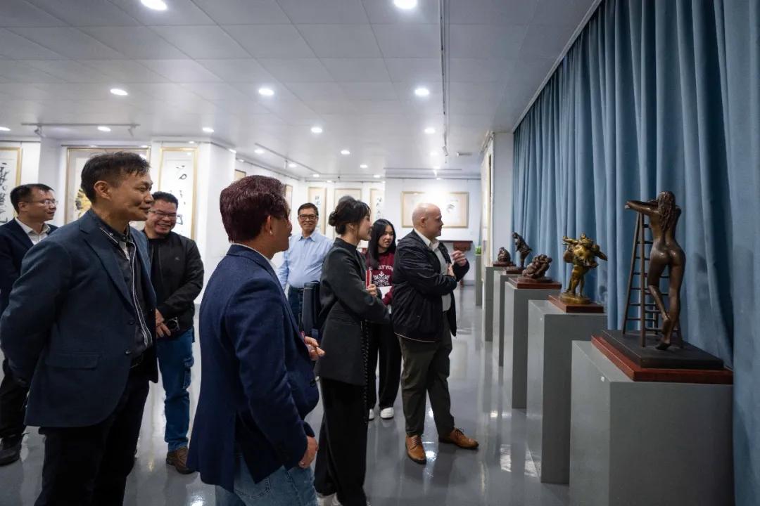 许鸿飞亲自引导参观并详细介绍了其工作室陈列的各类雕塑作品。从充满生命力的“肥女”系列到富有哲思的现代创作,许鸿飞向客人讲述每件作品背后的创作理念与艺术思考。此外,还分享了其举办雕塑世界巡展的丰富经历与深刻心得,特别提及在拉丁美洲多个国家展览时引起的热烈反响。