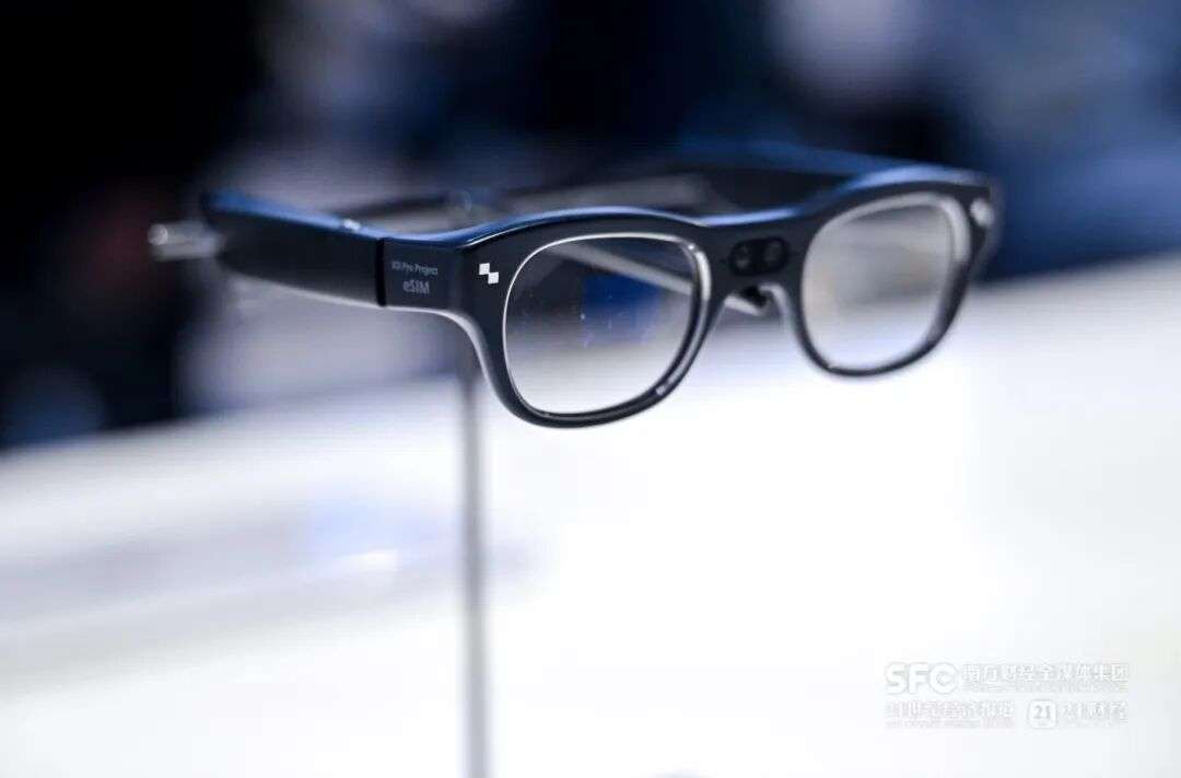 图为雷鸟创新展示全球首款支持eSIM功能的双目全彩AR眼镜