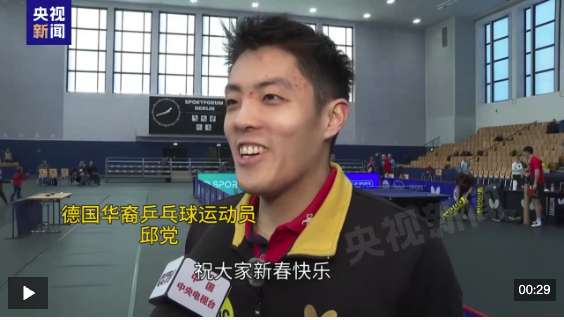 现效力于杜塞尔多夫俱乐部的华裔乒乓球运动员邱党在接受总台记者采访时表示,春节是全世界华人最重要的节日,春晚是每年有数亿观众收看的节目。他说,由于常年奔波各地参赛,春节期间并不总能与家人团聚,但他期待今年能看到春晚,也会提醒朋友们观看。