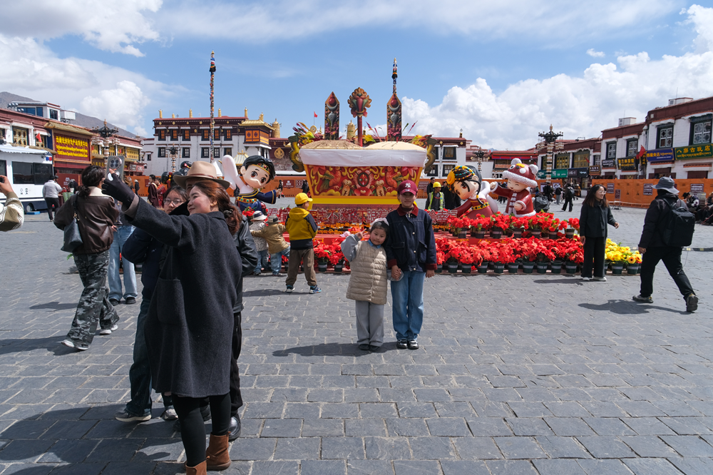 当前正值藏历一月,大昭寺广场仍保留着浓厚的“年味”,巨型切玛盒(藏历新年吉祥物)前,不少市民、游客以及朝佛信众驻足合影。