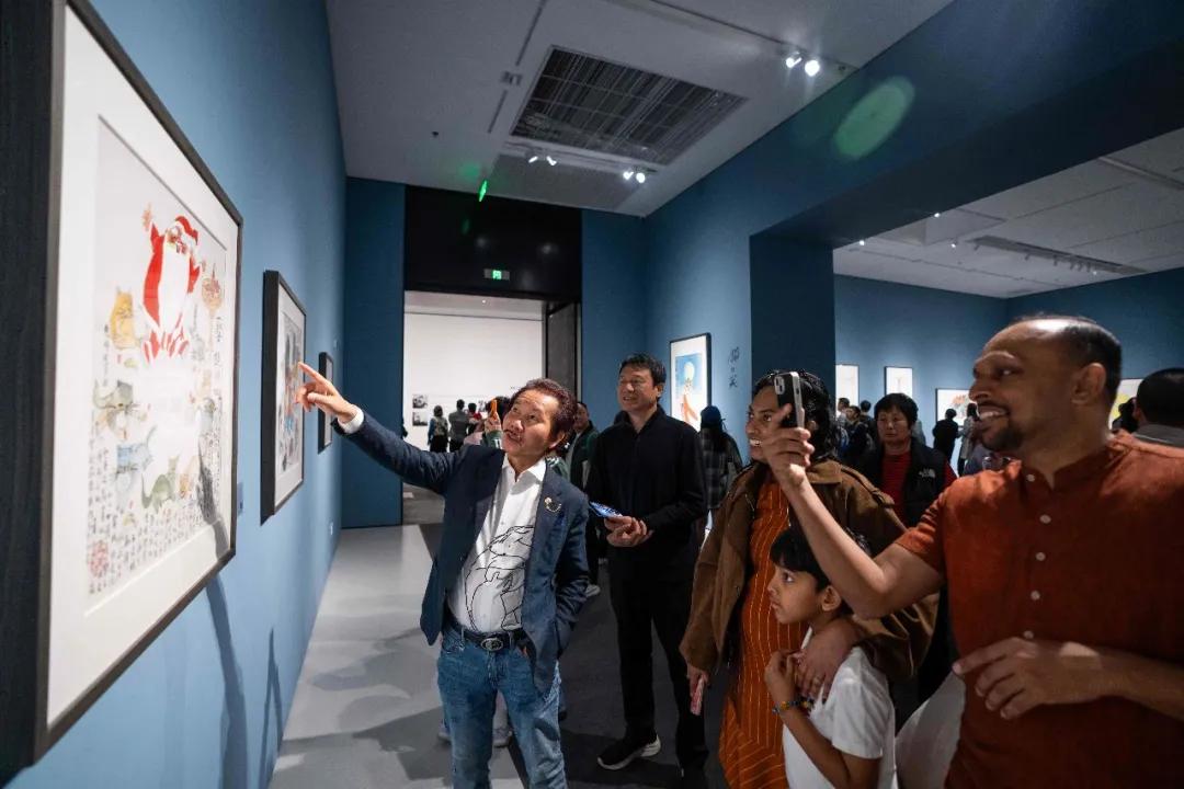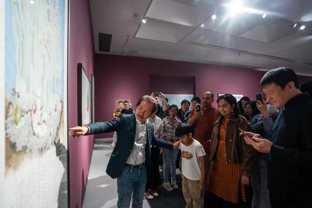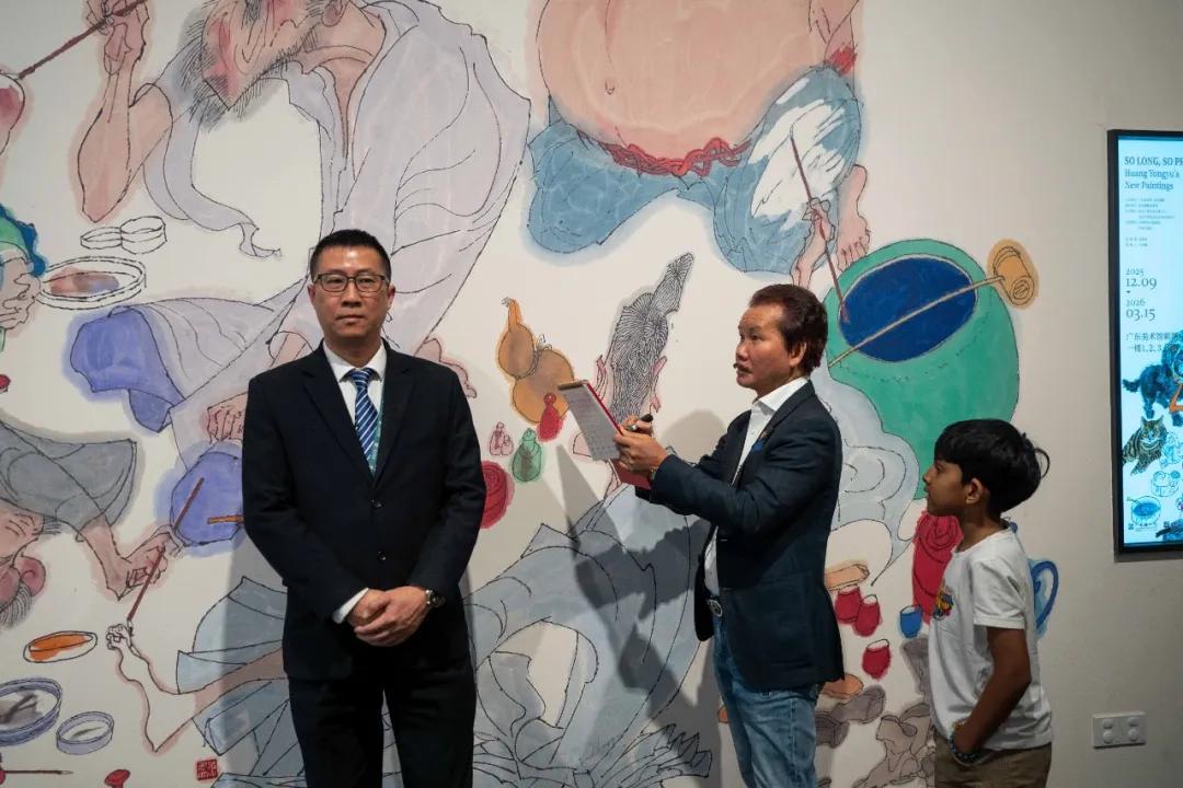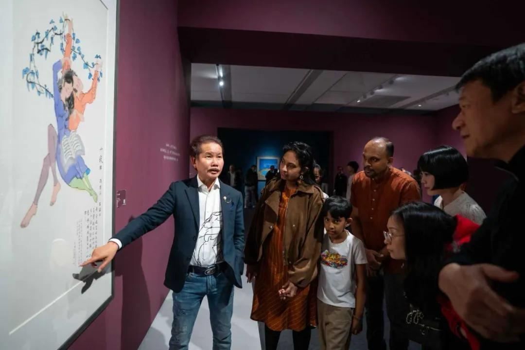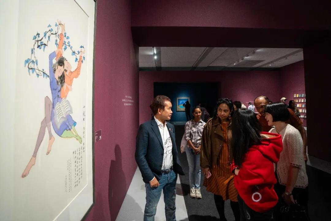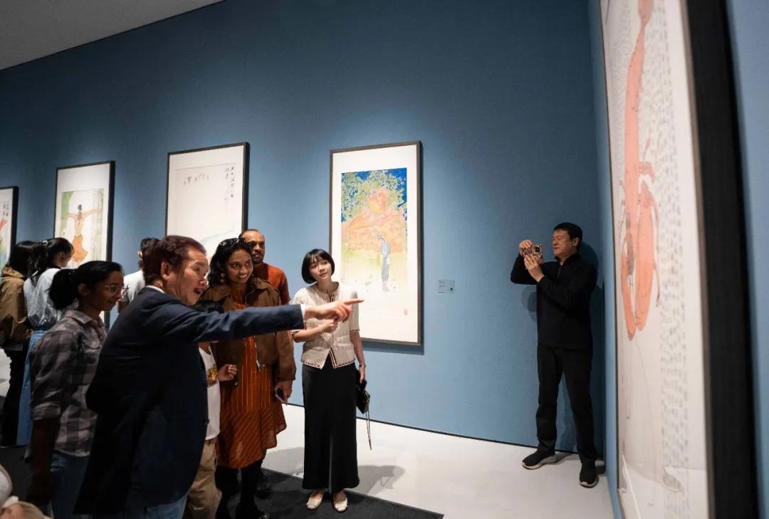 步入展厅,浓郁的艺术气息扑面而来。许鸿飞以其对黄永玉艺术的深刻理解,与总领事及观众穿行于一幅幅巨制之间,生动地分享了画作背后的故事,追忆与黄老往昔交往的点滴,解读其作品中蕴含的自由心境、幽默哲思以及对生命的炽热礼赞。