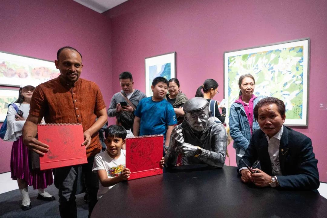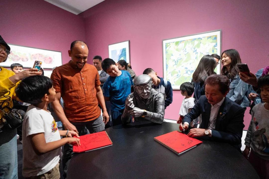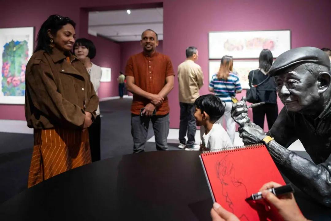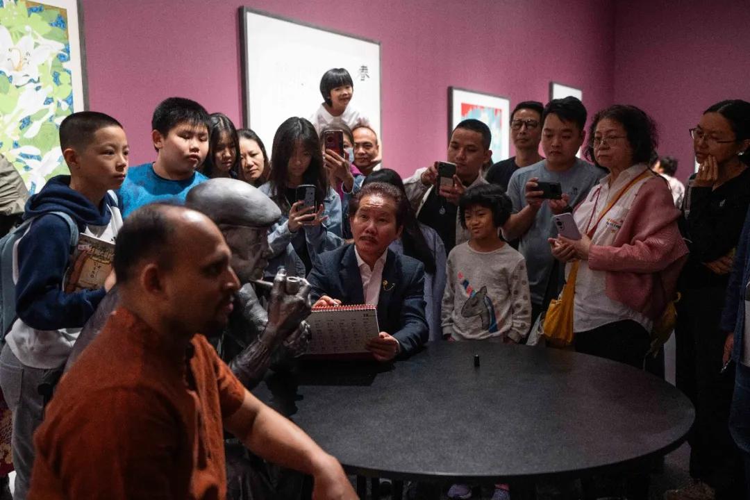 在展厅一隅,许鸿飞驻足于黄永玉先生的雕像旁。这座雕像由他与黄老当年共同创作完成,承载着两代艺术家之间的深厚情谊。他抚今追昔,向总领事讲述了当年与黄老一起构思、塑造这件作品时的情景,画面历历在目,言语间流露出对这位艺术前辈的深切怀念与崇高敬意。