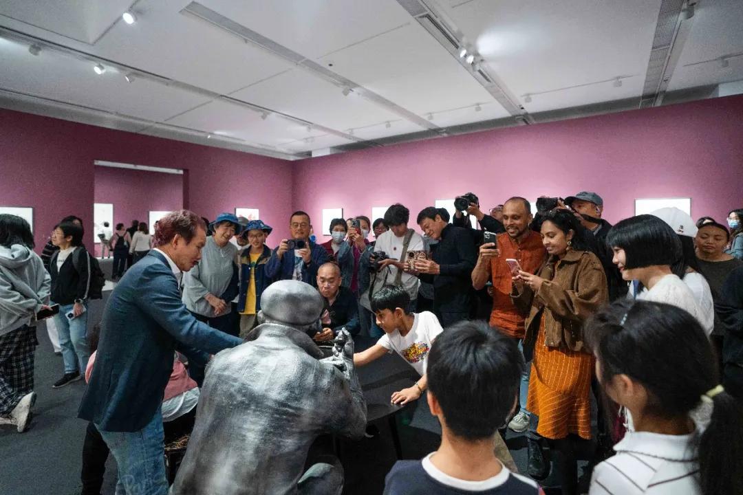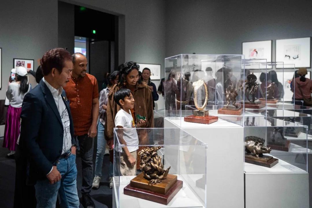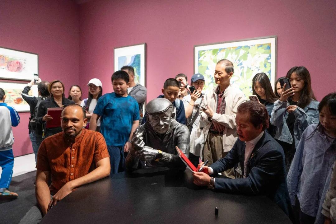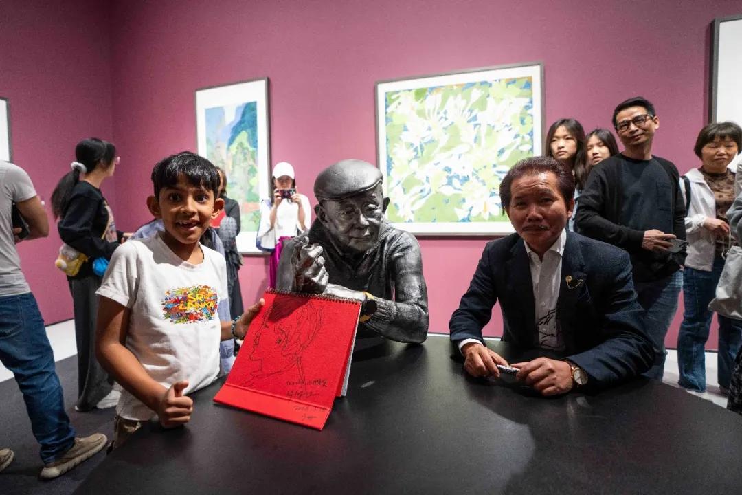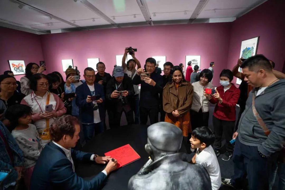 在展厅一隅,许鸿飞驻足于黄永玉先生的雕像旁。这座雕像由他与黄老当年共同创作完成,承载着两代艺术家之间的深厚情谊。他抚今追昔,向总领事讲述了当年与黄老一起构思、塑造这件作品时的情景,画面历历在目,言语间流露出对这位艺术前辈的深切怀念与崇高敬意。