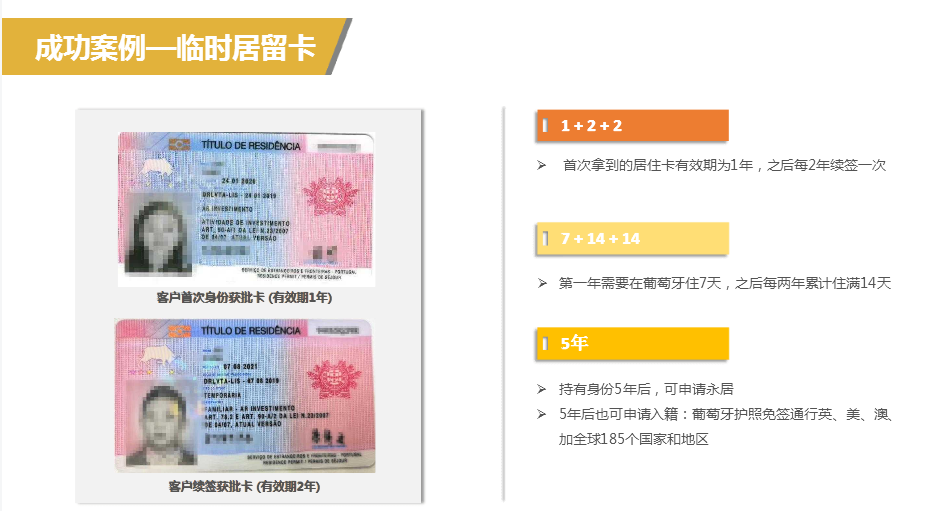6)准欧盟护照:持有黄金居留许可5年后,即可申请成为葡萄牙永久居民,也可以一步到位申请国籍,畅享欧盟护照便利。